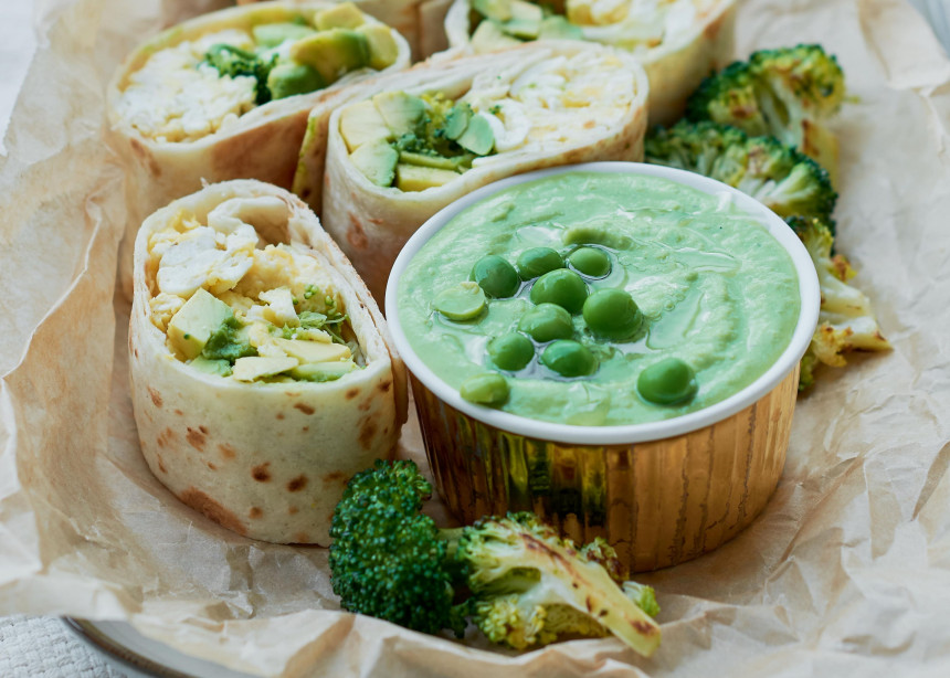 Katru tortilju uzsildiet uz pannas aptuveni 20 sekundes. Uzklājiet uz tām olu kulteni, brokoļus, avokado un nedaudz zaļo zirnīšu mērces. Salokiet tortiljas!