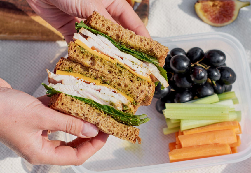 Uzsmērējiet pesto mērci uz abām maizes šķēlēm. Uz vienas maizes šķēles uzlieciet salātlapas, vistas fileju, sieru un piespiediet tos ar otru maizes šķēli. Lieciet sviestmaizi traukā līdzņemšanai. Pievienojiet sviestmaizei burkānus nomazgātus un stienīšos sagrieztus burkānus, seleriju un vīnogas.