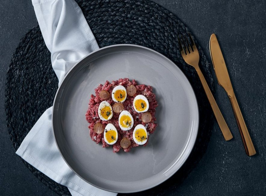Gaļai pievieno olīveļļu, melnos piparu un viegli kapātus kaperus. Gaļu kārto uz šķīvja un dekorē ar marinētiem sīpoliem un paipalu olām. Pārkaisa ar jūras sāli un timiāna lapiņām.