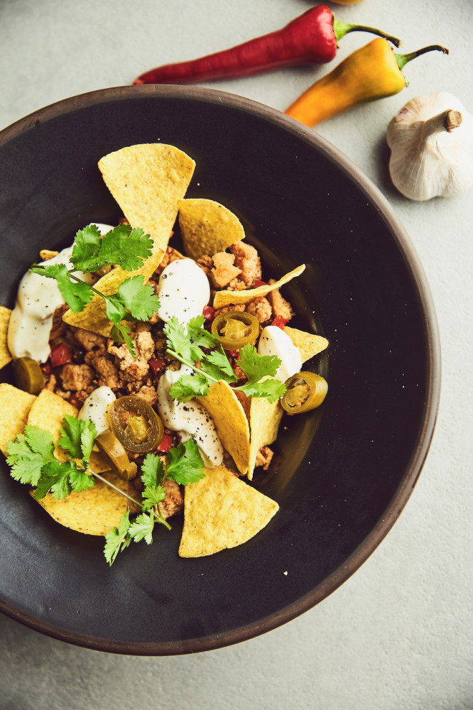 Pievieno laima sulu, sāli un melnos piparus. Liec skramblu šķīvjos, saspraud tajā načo čipsus, pievieno halapenjo, kinzu un pārlej ar ķiploku majonēzi.