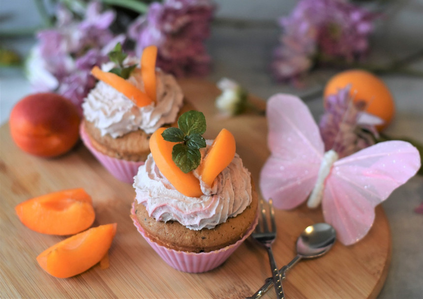 Kēksu formā liek papīra groziņus, tos līdz pusei pilda ar mīklu. Vidū liek aprikozes pusīti ar mīkstumu uz leju.