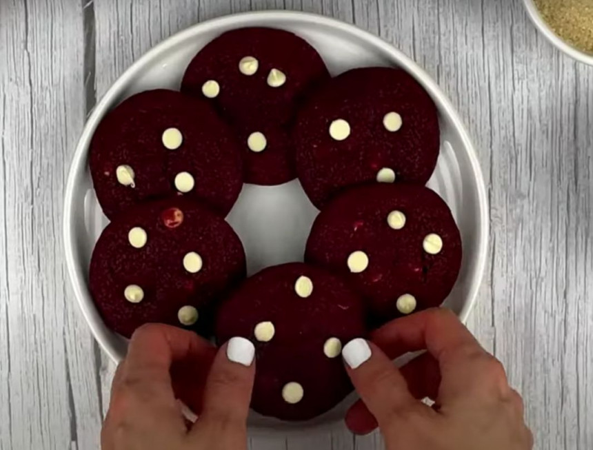 Kad cepumi gatavi, tos izņem no krāsns un dekorē ar atlikušajiem baltās šokolādes gabaliņiem.
