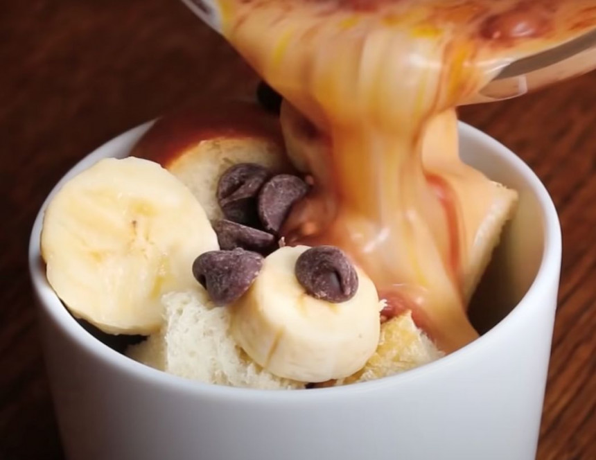 Krūzē ievieto pāris maizes gabaliņus, banāna šķēles un šokolādi, tad atkal liec kārtu ar maizi, banāniem un šokolādi.
