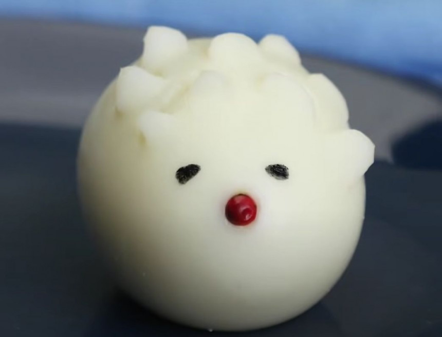 Process: ar nazi olā iegriež nelielus trijstūrus, kurus nedaudz piekārto ar koka zoba bakstāmo palīdzību. Ar pārtikas krāsu uzzīmē eža acis, bet ogas izmanto degunam.