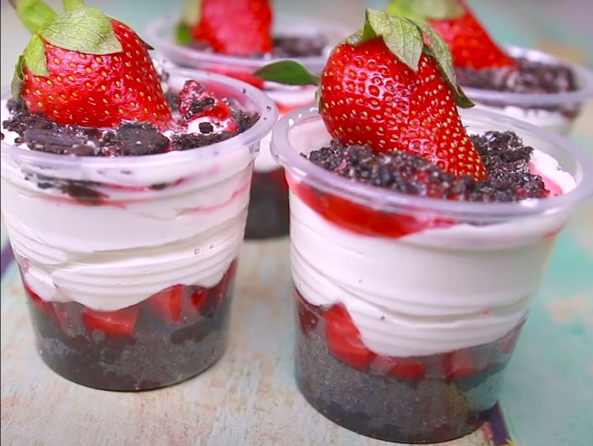 No ledusskapja izņem deserta trauciņus ar cepumu pamatni. Virs tās izkārto zemenes ar pūdercukuru.