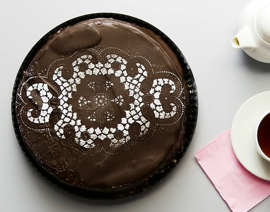 4. Pēc tam uzmanīgi noņemiet nost no kūkas uzklāto mežģīņu audumu.