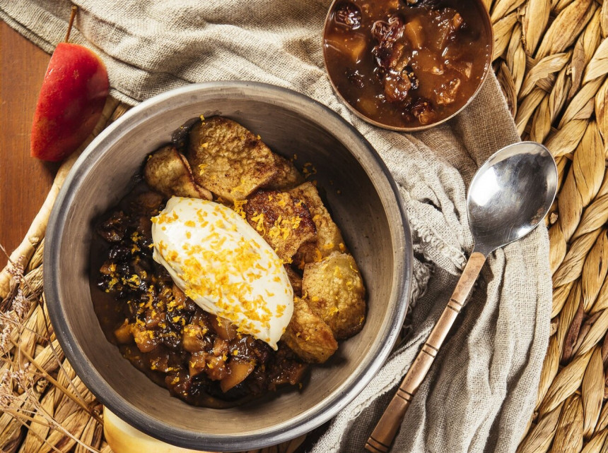 - Uz šķīvja kārto ceptus ābolus, pēc tam silto mērci. Pa virsu liek apelsīnu krēmu un visam pārrīvē apelsīna mizu.