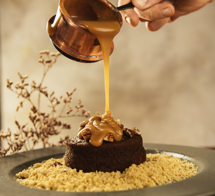 - Pudiņus pirms pasniegšanas atdzesē 5 - 10 minūres. Pasniedz siltu kopā ar karameli un sezama drupačām. Dekorē ar pekanriekstiem.
