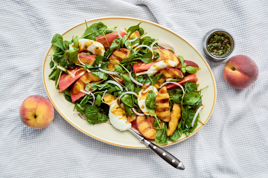 - Kārto uz šķīvja spinātu lapas, tomātu gabaliņus, grilētas nektarīnu daiviņas, sieru un sīpolus.