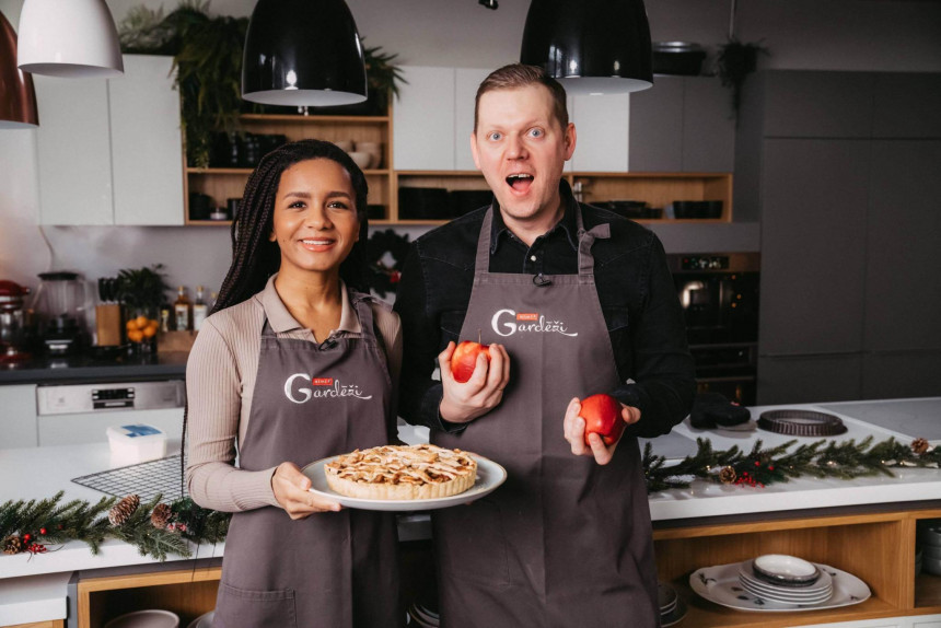 Dziedātāja Aminata kopā ar Rimi Gardēdi Normundu Baranovski cep gardo ābolu pīrāgu.