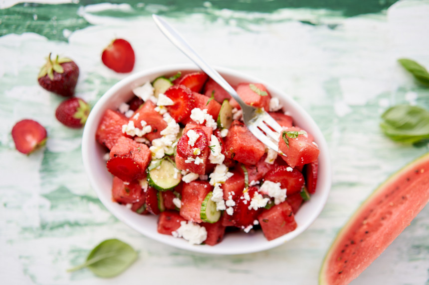 - Arbūzu sagriez nelielos kubiņos, gurķus un ogas sagriež ripiņās, smalki sakapā bazilika lapiņas.