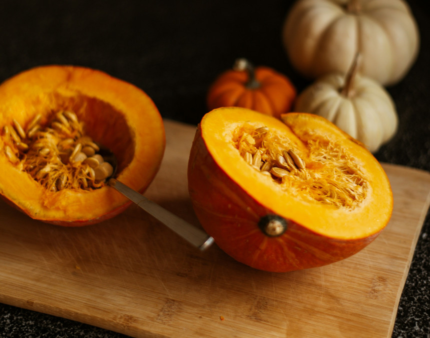 - Pa to laiku nomizojiet un sagrieziet ķirbi nelielos gabalos