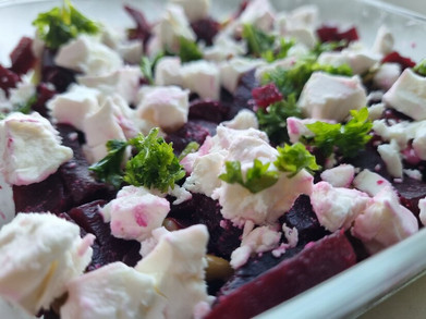 Kubiņos sagriež svaigo gurķi, vārītās bietes, ābolus, kazas sieru. Visu samaisa. Salātos iemaisa olīveļļu un balzamiko etiķi. Salātus pārkaisa ar sasmalcinātiem pētersīļiem un valriekstiem.