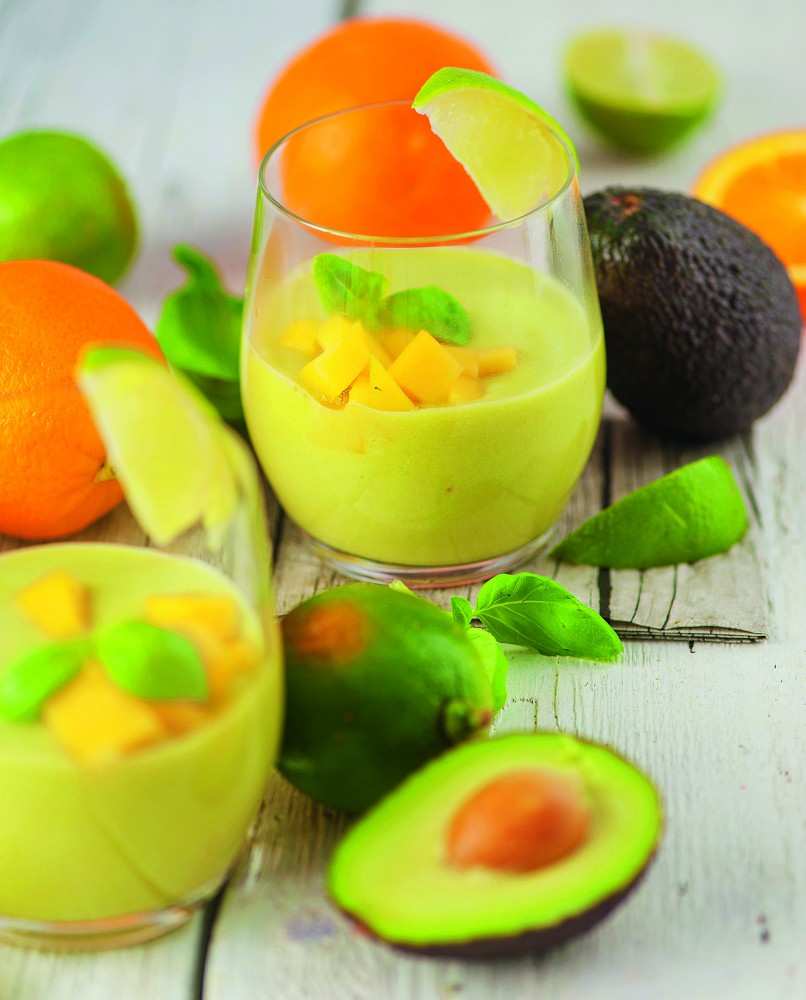 Sastāvdaļas: 1 avokado,1 mango, 1 laims, 3 apelsīni, puse saujas bazilika