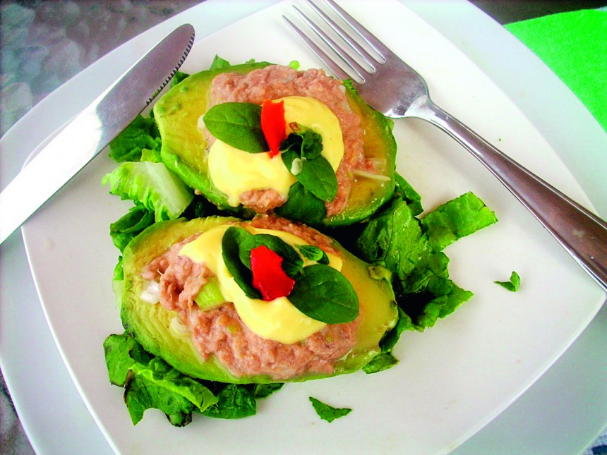 Sastāvdaļas. Divi lieli gatavi avokado, kārbiņa tunča konservu savā sulā, divi citroni, viena ēdamkarote olīvu eļļas, astoņas salātu lapas, viens liels tomāts, divas cieti vārītas olas, malti melnie pipari.