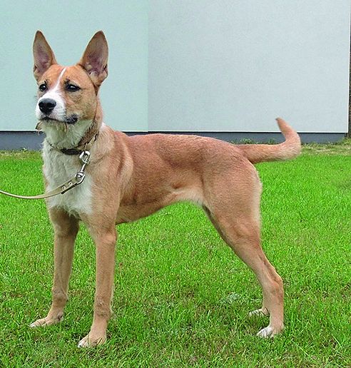 Vidējā auguma rozīgi baltā suņmeitene ar nelielu bārdiņu tika atrasta Ezera ielā Mangaļsalā.