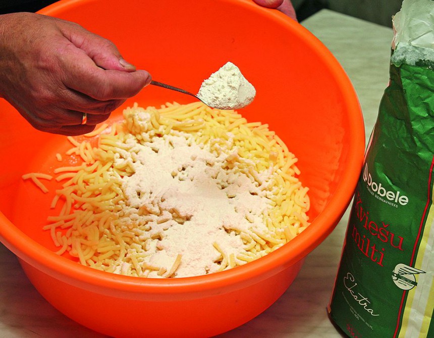 2. Kartupeļu masai pievieno sāli, maltus melnos piparus, piesit pāris olas un pievieno tik daudz kviešu miltu lai samīcītā kartupeļu masa nebūtu ne par cietu, ne par mīkstu.