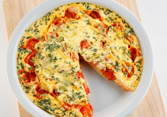Sastāvdaļas: 2 miltaini kartupeļi, 6 vistu olas, 100 grami piena, 50 grami rīvēta siera, 6 ķirštomāti, sāls, pipari, svaigs baziliks