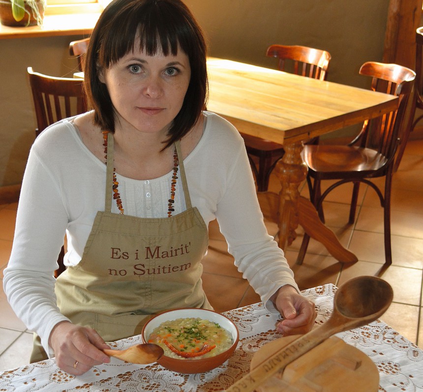 «Mēs ēdienkartē liekam tradicionālos suitu ēdienus. Rādām tūristiem to, kas nāk no Alsungas novada. Tā ir mana bērnības garša, jo atceros ēdienus, kurus gatavoja vecmāmiņa,» atklāj Mairita. Kafejnīcā var apskatīt arī suitu sievu tautas tērpus, un tie atnākuši līdz ar suitu sievām, kas reizēm dzied krogā, un sadziedāšanās notiekot pat trīs stundas. Lielākajai daļai suitu sievu ir vecie, mantotie tautas tērpi. «Man pašai diemžēl nav, jo, kad citi lustējas, man jāstrādā,» saka Mairita.