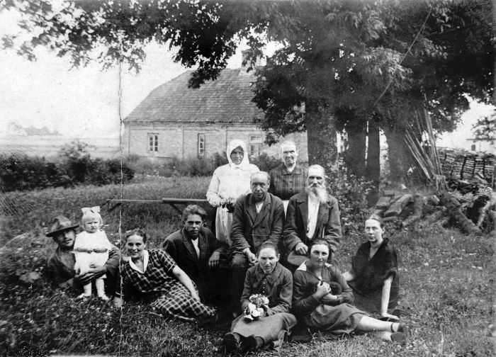 "Rakstnieks Alfreds Dziļums, vācot materiālus autobiogrāfiskam darbam "Pēdas rīta rasā", apceļoja Latviju un bildēja saimes. Viņš iegriezās arī manu senču mājās un pierunāja visus sapulcēties kopīgai fotogrāfijai. Vienīgais bērns šajā attēlā ir mana vecmāmiņa (viņa ir pa vidu starp vecākiem), savukārt vīrs ar balto bārdu ir viņas vectēvs, vagara dēls," ar savu senču saimi iepazīstina Krista Kalniņa. "Pirmais foto tapa 1928. gadā, bet šovasar, kad māja ir atjaunota, mēs, viņu pēcteči, nolēmām nofotografēties, izkārtojoties tieši tāpat kā mūsu senči vēsturiskajā fotogrāfijā." Attēlā no kreisās: Kristaps un Krista, starp viņiem – abu meitiņa Kristiāna, Kristas brālis, sēž Kristas tētis un mamma. Fotogrāfijā redzama arī Kristas māsa, Kristapa māsa un ģimene, kas jaunajai ģimenei daudz palīdzējusi mājas tapšanā.