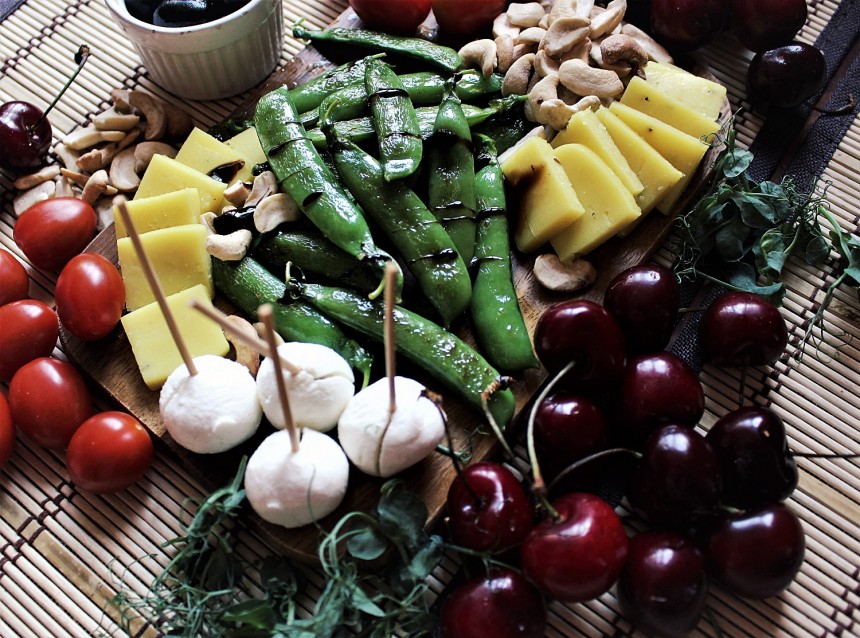 Zirņus apmaisa ar olīveļļu un grilē uz uguns 3-4 minūtes (caurumotā traukā, lai zirņi nekrīt ugunī). Sagriež sieru. Sieru kārto uz šķīvja, pievienojot zirnīšus, svaigos dārzeņus un riekstus! Pārkaisa ar šķipsniņu sāls un pasniedz līgotājiem!