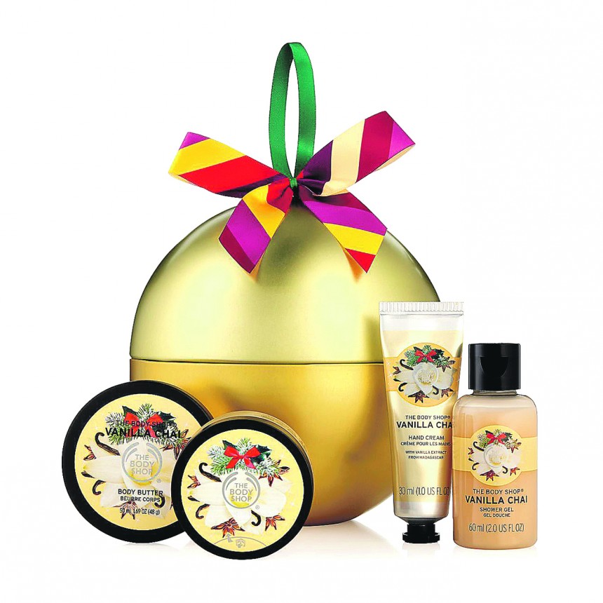 Attēlā - vanilla chai dāvanu komplekts (29,50 eiro), kas līdzinās krāšņai eglīšu mantiņai - tajā ietilpst dušas želeja, roku krēms, cukura skrubis un ķermeņa sviestkrēms, un tā atkarību raisošo smaržu veido bagātīga garšvielu buķete - vaniļa, kardamons, anīss un safrāns