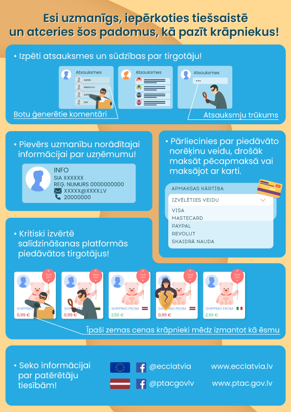 ECC Latvia un PTAC mājaslapās un sociālajos tīklos nodrošina aktuālu un uzticamu informāciju par patērētāju un tirgotāju tiesībām un pienākumiem. Saskaroties ar problēmām, veicot pirkumu Latvijā, droši vērsies PTAC, savukārt, ja konkrētais gadījums ir saistīts ar pirkumu no citām ES valstīm, sazinies ar ECC Latvia.