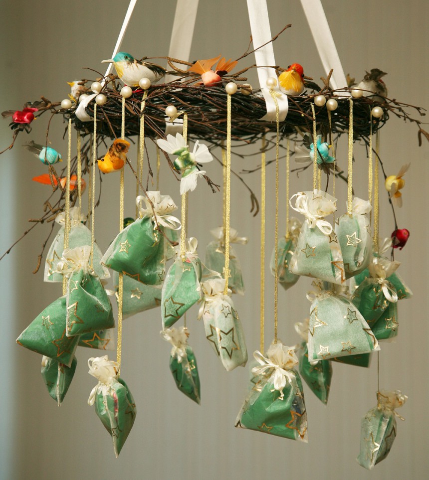 Nepieciešamie materiāli: stieple vai elastīgas klūgas,vijīgi bērza zari, smalka stieplīte, 24 organzas vai cita materiāla maisiņi, krāsainas auduma lentes, zaļš zīdpapīrs, konfektes, kniepadatas ar perlamutra galviņām, grieznes, dekoratīvi putni
