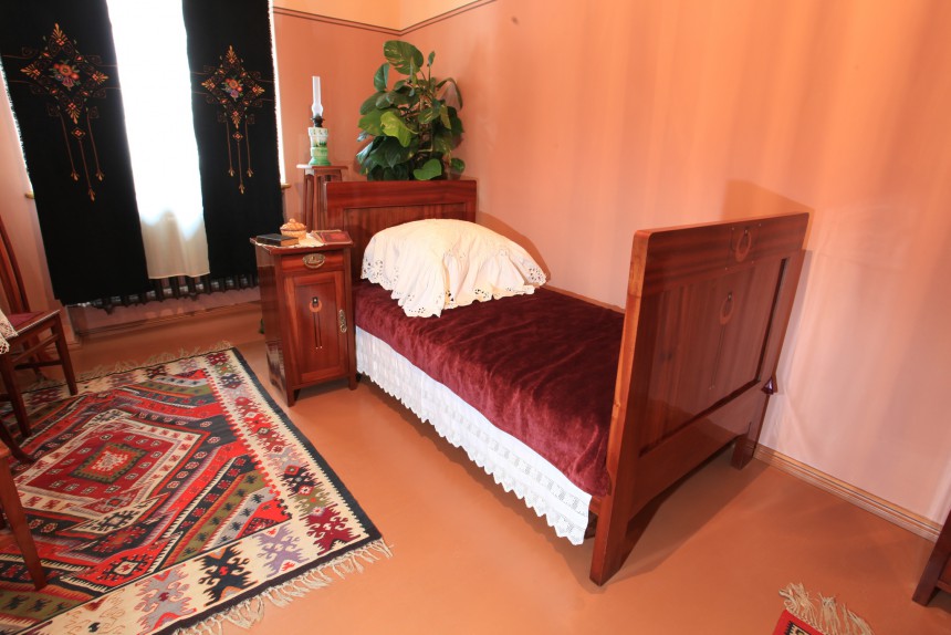 GUĻAMISTABA. "Šajā telpā pie loga ir oriģināli, pēc Pirmā pasaules kara tapuši aizkari, kuros spilgti izpaužas nacionālais romantisms," norāda speciāliste. "Mums paveicās, ka varējām iegādāties guļamistabas iekārtu pilnā komplektācijā: gultu, kumodi, nakts skapīti, skapi. Jūgendstilam bija raksturīgi uz grīdas klāt vairākus paklājus, pat vienu virs otra, tāpēc vienā istabā varēja būt pat desmit paklāju.".