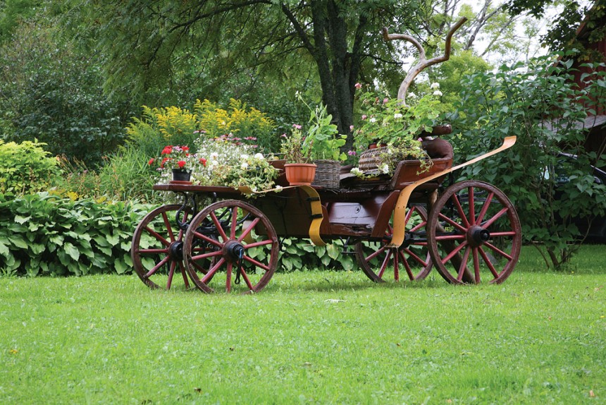 Puķu podi, kas zied visu vasaru un grezno pagalmu, salikti vecajos ratos. Tā atrasts izmantojums arī šādiem rīkiem, kas saimniecībā vairs nav lietojami. "Te jūtamies kā Dieva ausī – miers un klusums, pēc sirds patikas varam baudīt pievilcīgu ainavu.".