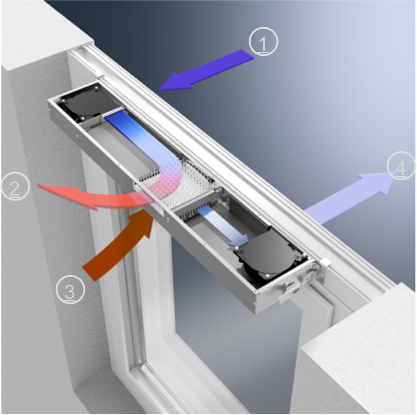 Schüco VentoTherm nodrošina automātisku ventilāciju ar aizvērtu logu. Pateicoties unikālajai sistēmai, tagad iespējams efektīvs decentralizētas ventilācijas risinājums. Logā ir iebūvēta ventilācijas sistēma ar siltuma atgūšanas iespēju – kontrolējama gaisa apmaiņa, neatverot logu. Tādējādi tiek optimizēts enerģijas patēriņš, mikroklimats un gaisa kvalitāte telpā.