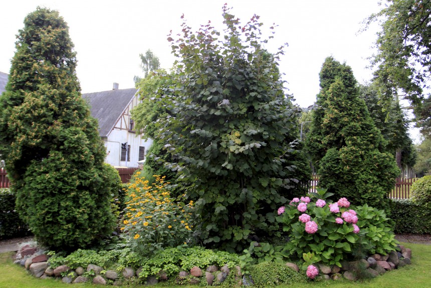 Liene teic, ka viņa nav dārza vergs, kam par visām varītēm jārušinās dārzā augu dienu. «Mēs dārzā strādājam normas robežās. Vīram ir augsts asinsspiediens, tāpēc viņam ļauju tikai nopļaut zālienu un apcirpt dzīvžogu, pati tieku galā ar zemes darbiem,» viņa stāsta. Mērenums tiek ievērots arī augu izvēlē. Dārzā lielākoties sastopami klasiski augi un to krāsas netiek pārlieku miksētas. «Es pārāk nemīlu eksotiskus brīnumus, vislabāk man patīk hortenzijas, lilijas, īrisi, rudenī zied dālijas. Arī krāsu ziņā man patīk vienmērība. Piemēram, dālijas man ir tikai sarkanas. Dažreiz kāds palūdz iedot stādiņu, pretī solot kādu citu krāsu, bet man to nemaz negribas,» stāsta Liene. Tāpat saimnieku pūrā glabājas daudz interesantu stāstu par lietām, kas atceļojušas uz dārzu, un parādībām, kādas tajā dažkārt vērojamas. «Vasarā mums tieši zem ābeles zariem ļoti skaistiem, maigi rozā ziediem zied anemones. Šovasar tās bija iespraukušās starp zariem un augļiem, liekot domāt, ka ābelei vienlaikus ir gan ziedi, gan augļi. Bija fantastiski skaisti,» teic saimnieki.