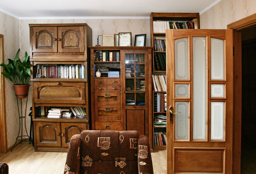 "Šā dzīvokļa iepriekšējie saimnieki darbojās banku sektorā, pārstāvēja tos, kas deviņdesmito gadu sākumā tika pie zināmas turības. Tāpēc šajā dzīvoklī ir gan ozolkoka parkets, gan ozolkoka durvis. Tāds korekts viesnīcas stils," zina teikt Arnis Kluinis. "Pārceļoties uz jauno dzīvesvietu, man vislielākais prieks ir par to, ka beidzot ir vieta, kur novietot grāmatas. Mums to ar Ilzi ir daudz." Daļa skapju mantota no iepriekšējiem dzīvokļa saimniekiem, daļa – pašu iegādāta. Arnis ar Ilzi ir ļoti apmierināti ar "Grīvas mēbelēs" pirkto grāmatu skapi, kas atrodas pa vidu telpas dibenplānā. "Tas ir pamatīgi nostrādāts, tāpēc nav jābaidās, ka pēc pāris lietošanas gadiem izjuks, kā tas notiek ar dažiem lamināta skapīšiem.".
