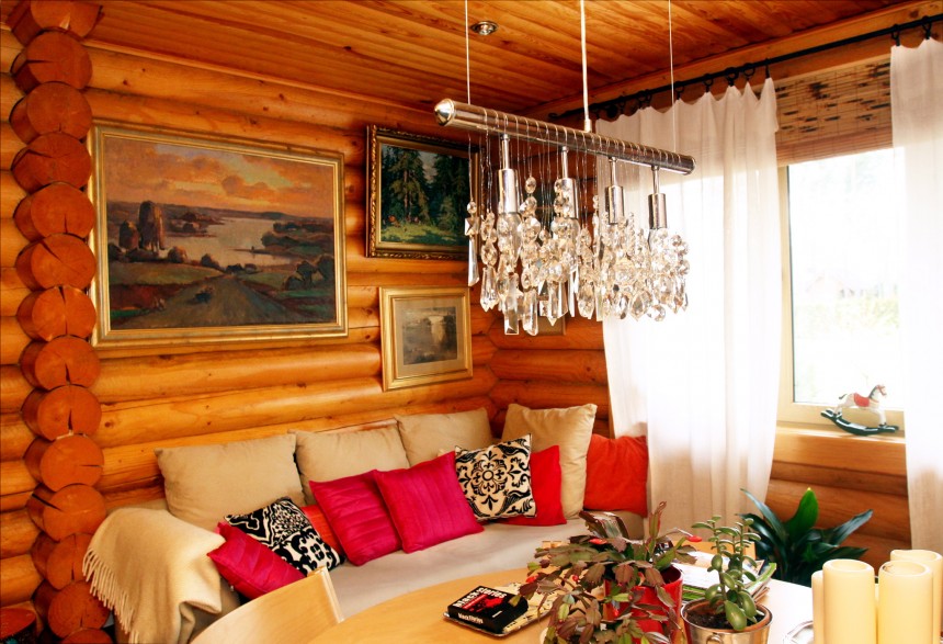 SPILVENU RINDA. "Var būt daudz viedokļu, kādam jāizskatās guļbūves iekārtojumam, bet galavārds tomēr pieder cilvēkam, kas konkrētajā mājā dzīvo. Tāpēc manā dzīvojamā istabā, piemēram, nav vis puķaina dīvāna, ko par ļoti piemērotu šādai telpai uzskata viena no manām draudzenēm, bet ir gaišs dīvāns ar daudz spilveniem. Cik es bieži uz tā apsēžos, tas jau ir cits jautājums," dzidri iesmejas atraktīvā mājasmāte. Viņa arī nebaidās nosaukt par kiču kristāla griestu lampu pie guļbūves griestiem. "Nu jau dažādi stereotipi pamazām izplēnē, turklāt, iekārtojot savas mājas, es galvenokārt balstos uz to, vai man konkrētā lieta vai lietu salikums patīk. Ziemassvētkos, kad uz galda ir salikti no omes mantotie greznie trauki, tie ļoti labi sader ar kristāla lustru.".