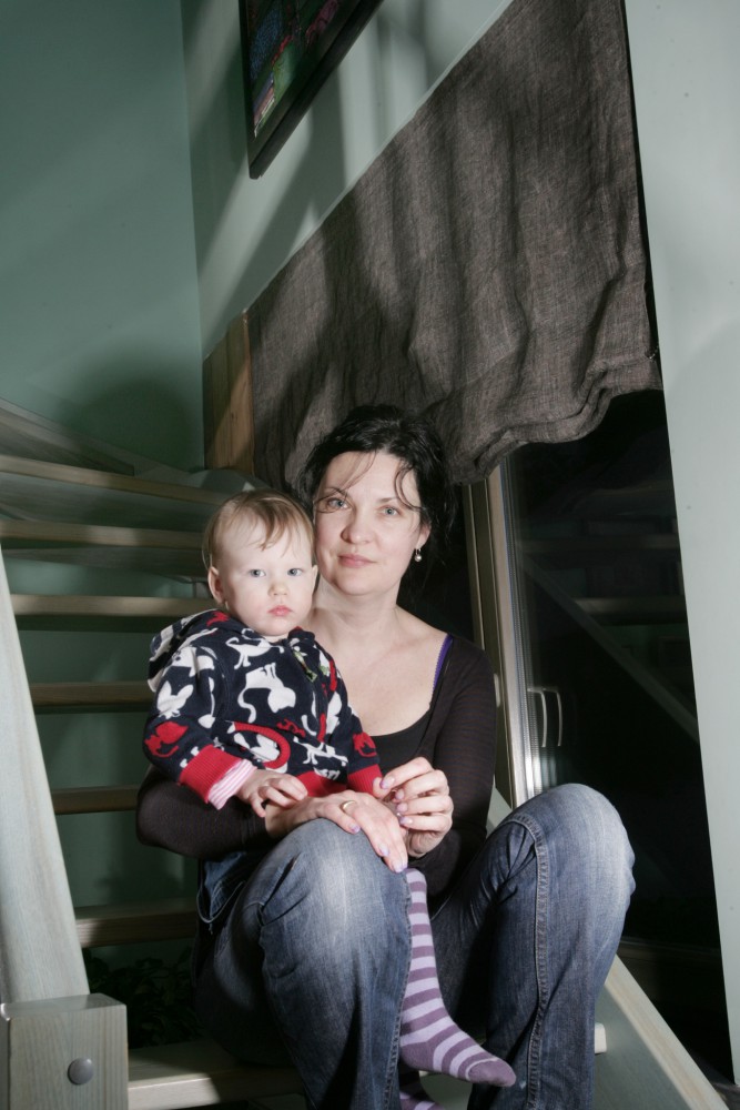 SAIMNIECE. Mājas saimniece Ineta Strēle ar jaunāko meitiņu Sofiju uz kāpnēm, kas ved uz izbūvētajiem bēniņiem, kur tagad atrodas vecāku guļamistaba.
