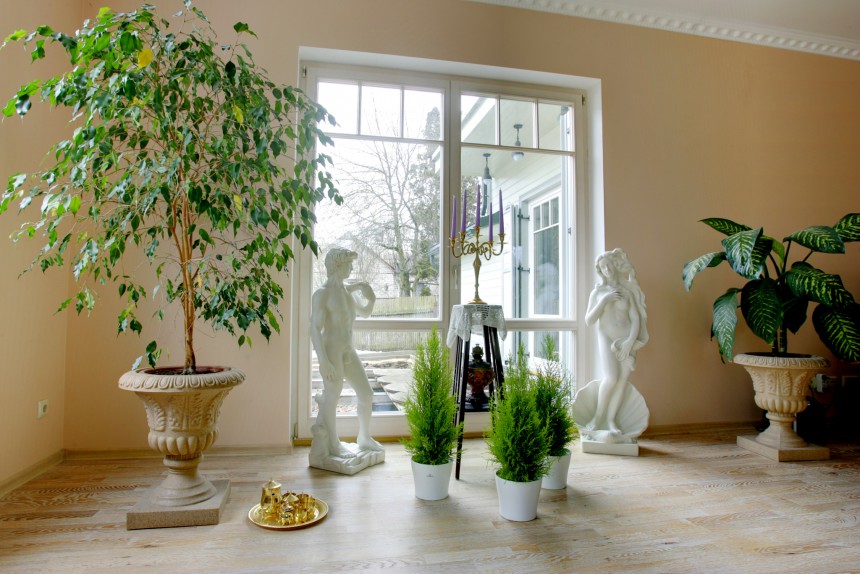 Mājokļa interjera veidošana vēl turpinās. Pirmā tikusi iekārtota virtuve, arī vannas istabas ir kārtībā, bet halle un ēdamistaba pagaidām top. Šobrīd plašajā telpā atrodas no Jāņa radiem mantota kumode, no Indijas atceļojusi pūralāde (viss, kas saistās ar šo zemi, esot Judītes interešu lokā) un televizors. Halles vienā daļā uz grīdas segts ozolkoka parkets, bet otrā daļā, kur ir dzīvāka kustība, - klātas flīzes.