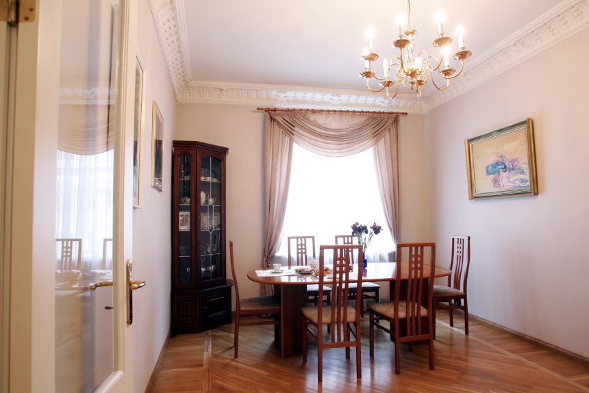 VEIDOJUMI. Ne tikai krāsnis, bet arī sienas veidojumi augstajos griestos ir atjaunoti agrākajā izskatā. «Iepriekšējā dzīvoklī mums nebija ne krāšņu, ne veidojumu griestos. Remonts dzīvoklī tika veikts pirms desmit gadiem, bet ir izjūta, ka tas bijis pavisam nesen, jo viss joprojām ir saglabājies labā kvalitātē.» Uz sienām dzīvoklī meistari ieteikuši izmantot modernu tehnoloģiju – izlīmēt stikla šķiedras tapetes, kas pasargā sienu no plaisāšanas un ir mitrumizturīgas.