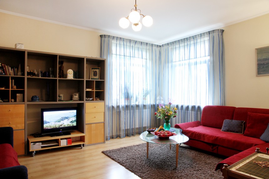 ZILĀ ISTABA. Sanitai bijusi vīzija, ka dzīvojamo istabu vēlas zilos un sarkanos toņos, jo interjeru vajadzēja pieskaņot zilajam dīvānam. «Draudzenei Kristīnei pieder aizkaru firma. Tad, kad pateicu, ka vēlos zilus aizkarus, viņa iebilda – būs pārāk drosmīgi, taču nevienu brīdī neesmu nožēlojusi savu izvēli.» Sanita prātojusi, kurai krāsai aizkariem dot priekšroku – zilai vai sarkanai, jo mierīgie bēšīgie toņi nav viņas. No bufetes izņēmusi laukā vienu detaļu un aizgājusi uz veikalu pirkt krāsu, lai nokrāsotu istabas sienu tādā pašā krāsā. Tagad bufete izskatās tādā pašā tonī kā siena, lai gan ir atšķirīgas.