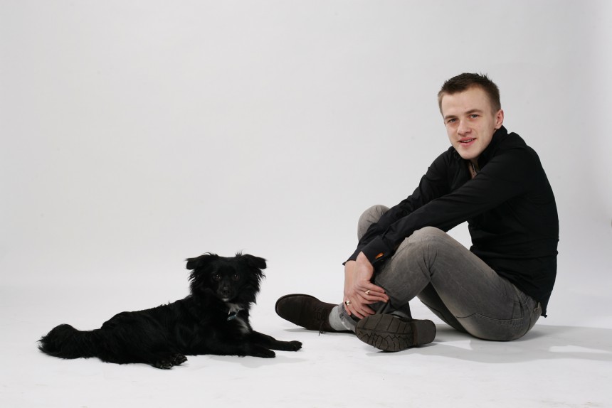 Uz interviju kāda tirdzniecības centra kafejnīcā Kārlis ierodas ar Rūdi padusē. Apsēžas pie galdiņa, bet melnspalvainais rējējs iekārtojas viņam klēpī. Rūdis visu sarunas laiku ir mierīgs un nosvērts, vien ik pa brīdim sarosās, kad kafejnīcā ienāk apmeklētājs, kas viņam šķiet interesants. Kārlis glauda suņuka galvu, bet viņš pa retam atskatās uz saimnieku un arī intervētāju. Tumšo acu skatiens ir atbruņojošs.