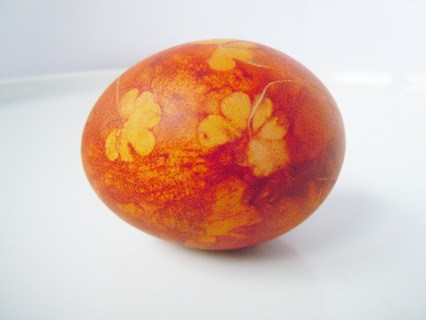 Šeit izmantotas brūnās olas, kas krāsotas sīpolu mizu novārījumā. Katru olu viegli samitrina, apliek ar dabas materiāliem un lielām samitrinātām sīpolu mizām, ietin drāniņā, notin ar diegu, liek aukstā novārījumā, kam pievienots sāls, uzvāra, vāra 10 minūtes un atdzesē, cik pietiek pacietības. Olas uzmanīgi izsaiņo un, ja vēlas, ieziež ar kādu taukvielu, lai būtu spīdīgas.