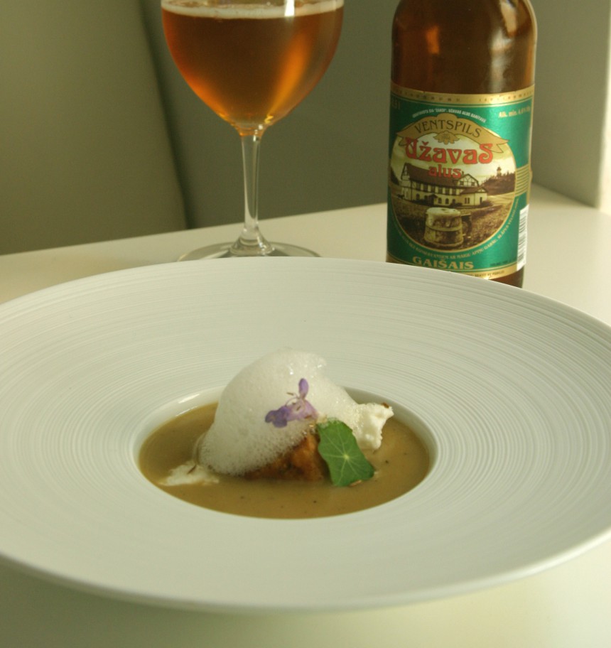 Sastāvdaļas - 3 ēdamkarotes olīveļļas, 1 smalki sagriezts sīpols, 2 seleriju kāti, svaigi malti melnie pipari, 2 lauru lapas, 2 ķiploka daiviņas, 2 ēdamkarotes miltu, 0,75 l vistas buljona, 0,75 l Užavas alus, 200 g Jāņu siera, timiāna zariņš,ķiploku grauzdiņi