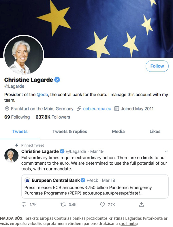Konfekšu, t.i., eiro ražotne ir Eiropas Centrālā banka (ECB) Vācijas pilsētā Frankfurtē. Tāpēc paliksim pie tāda emisijas apjoma, kādu par atbilstošu ECB padomes lēmumiem 19. martā nosauca Vācijas ziņu dienests “Deutsche Welle”. “Neatkarīgā” par šiem pašiem ECB lēmumiem informēja 20. martā publikācijā “Koronaslimības pabalstu Latvijai nemaksās”, noapaļojot emisiju uz vienu triljonu eiro. Proti, ka ECB jau bija apņēmusies drukāt 20 miljardus eiro mēnesī un martā piemetusi šai emisijai vēl 750 miljardus ar īpašu nosaukumu “Pandemic Emergency Purchase Programme” - tātad programmu ārkārtas iepirkumam pandēmijas dēļ. Tīri aritmētiski tas kopā dotu 990 miljardus eiro, bet, ja vācieši saskaitījuši vairāk, tad lai tā būtu, jo viņi taču šiem notikumiem tuvāk. Nav šaubu, ka jebkura nosauktā summa ir tikai provizoriska. “Deutsche Welle” to akcentēja ar saiti uz ECB prezidentes Kristīnas Lagardas tviterkontu kā apliecinājumu naudas drukāšanai “no limits”. “Deutsche Welle” pastāstīja arī to, ka K. Lagarda nedēļu pirms ECB padomes lēmuma bijusi “drīzāk nogaidoša, bet tagad piespiesta rīkoties”.