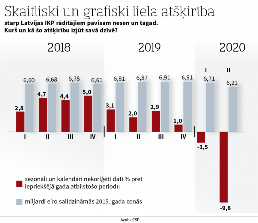 CSP aprēķini rāda, IKP pēc ātrā novērtējuma šā gada 2. ceturksnī bijis par 9,8% mazāks nekā pirms gada. Tepat jāpatur vērā vairāki precizējumi, ka tie ir rezultāti ātrajam novērtējumam pēc sezonāli un kalendāri nekoriģētajiem datiem ar CSP atrunu, ka krīzes laikā gan nekoriģēti, gan sezonāli koriģēti dati potenciāli var tikt pakļauti lielākām datu revīzijām, nekā tas ir bijis pirmskrīzes periodā. Tāpēc nevajag uzskatīt par statistiķu vai žurnālistu nolaidību to, ka gan augustā, gan vēlāk var parādīties citi rezultāti vienam un tam pašam, jau tagad pagājušajam laika periodam. Šīm izmaiņām tomēr nevajadzētu būt ievērojamām attiecībā pret galveno ziņu, ka IKP ir ļoti ievērojami samazinājies. Pie CSP datu koriģēšanas jau ir ķēries “Eurostat”. ES dalībvalstu rezultātu salīdzināmība dēļ Latvija tiek eksponēta ar IKP samazinājumu par 9,6%. Atšķirība starp dažādiem mērījumiem par 0,2 procentpunktiem ir mazāka, nekā iespējams konstatēt no iedzīvotāju un arī uzņēmumu vairākuma skatpunktiem; tās varētu būt svarīgas ja nu vienīgi finanšu spekulantiem, kas Latvijai nav būtiski.