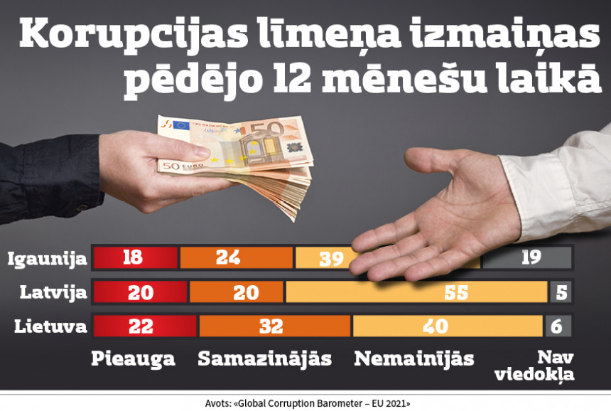 Latvijas un Lietuvas iedzīvotāju vērtējumā valsts netiek galā ar korupcijas apkarošanu. Tā domā 66% Latvijas iedzīvotāju, 48% Lietuvas iedzīvotāju un 37% Igaunijas iedzīvotāju.