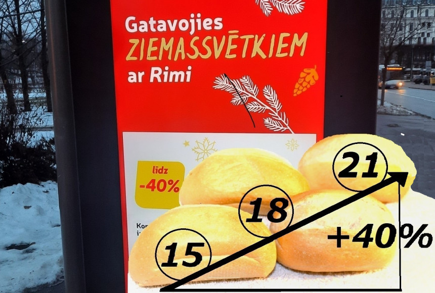 Tā nu tas sakrita, ka RIMI vienlaicīgi izvietoja reklāmas plakātus, kuros solīta 40% cenas atlaide konditorejas izstrādājumiem, bet pacēla par 40% cenu savam miltu izstrādājumam uz robežas starp maizi un bulciņu. Neko krimināli sodāmu RIMI, protams, neizdarīja. Reklāmas plakātos paskaidrots, ka cenu pazeminājums attiecas uz “Latvijas maiznieka” produkciju, bet 70 gramu mazmaizītes RIMI cep pats.
