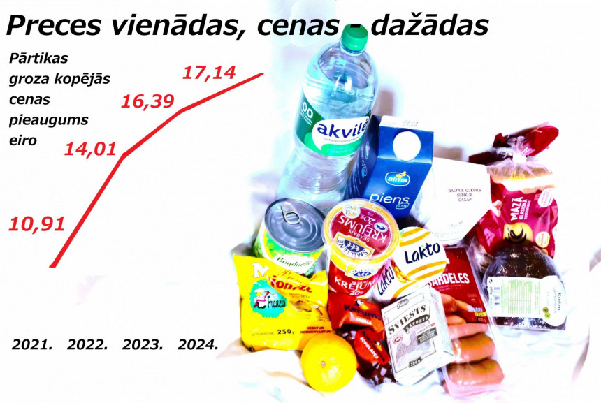 2024. gads devis cenu rekordu gan pēc nomināla, kas samaksāts veikalā, gan pēc koriģētās cenas. Faktiskais pārtikas groza sadārdzinājums bijis no 16,39 līdz 17,14 eiro. Procentos pieaugums atbilst 4,6%. Statistiķu dati par cenām šā gada martā vēl nav iespējams, jo Lieldienās mēnesis nebija beidzies. Par februāri Centrālā statistiska pārvalde noteikusi 0,4% inflāciju pret 2023. gada februāri. Ielūkojoties statistiķu aprēķinos dziļāk, atklājas pārtikas cenu palielināšanās par 2,2%. Ja marta rādītāji izrādīsies līdzīgi februāra rādītājiem, atšķirība starp 4,6% un 2,2% nav pietiekama, lai celtu traci, ka oficiālā statistika neuzrāda patieso inflāciju. Ļoti ierobežoto, arī šo vārdu burtiskajā nozīmē pārtikas grozā ieliekamo preču daudzuma kopējo cenu viegli iespaido nejaušības.