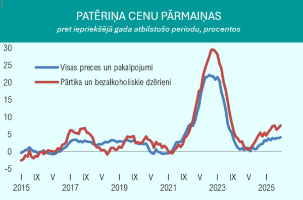 Pārtikas cenu dinamika Baltijas valstīs šajā gadā bijusi atšķirīga. Igaunijā visa 2025. gada laikā pārtikas cenas turpina pieaugt. Lietuvā un Latvijā, sākot ar maiju, cenas stabilizējas un atsevišķos mēnešos pat samazinājušās.