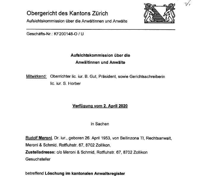 Šā gada 3. aprīlī Šveices Cīrihes kantona Augstākās tiesas Advokātu uzraudzības komisija ir dzēsusi Rudolfu Meroni no Šveices Advokātu reģistra ‒ liecina “Neatkarīgās” rīcībā nonākusi oficiāla dokumenta kopija.