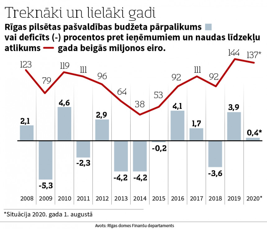 Pagājušo gadu Rīga ir beigusi ar 144 miljonu eiro atlikumu, ar kādu pietiek un pāri paliek visa šā gada deficīta segšanai. Viennozīmīgi apsveikt šādu pārpalikumu nav pamata, jo tas veidojas, savlaicīgi neveicot ieguldījumus pilsētas infrastruktūrā.