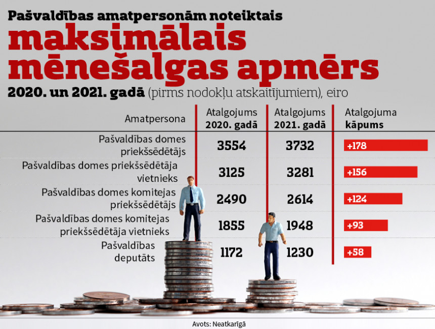 Pašvaldības amatpersonas un deputāti atalgojumu saņem atbilstoši Valsts un pašvaldību institūciju amatpersonu un darbinieku atlīdzības likumam. Taču atšķirībā no citām amatpersonām, kurām algas apmērs ir fiksēts, pašvaldības deputātu un amatpersonu atalgojumu var noteikt katra pašvaldība pēc saviem ieskatiem, tiesa, nepārsniedzot noteiktus griestus. Pašvaldības domes priekšsēdētājam mēnešalgu nosaka, piemērojot koeficientu, kas nav lielāks par 3,64; pašvaldības domes priekšsēdētāja vietniekam ‒ līdz 3,2; pašvaldības domes komitejas priekšsēdētājam ‒ līdz 2,55; pašvaldības domes deputātam ‒ līdz 1,2. Tātad pašvaldības priekšsēdētāja alga mēnesī šogad nedrīkst pārsniegt 3554 eiro uz papīra, vietnieka ‒ 3125 eiro, komitejas priekšsēdētāja ‒ 2490 eiro, deputāta ‒ 1172 eiro. Nākamgad, pildot šādus pašus amatus, saskaņā ar Valsts un pašvaldību institūciju amatpersonu un darbinieku atlīdzības likumu